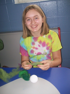 To felt a ball, first you wrap wool tightly around a Styrofoam ball.